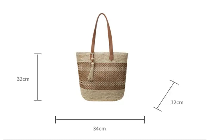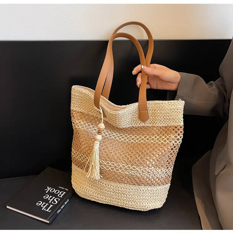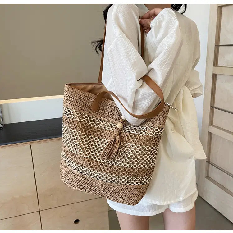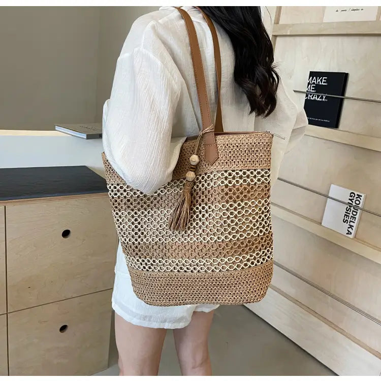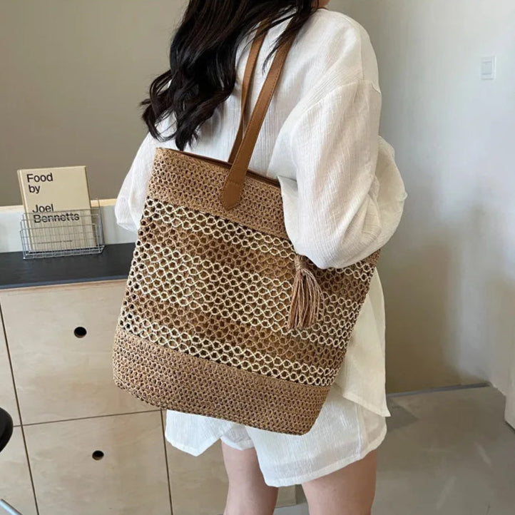 優しいベージュと落ち着いたブラウンのコントラストが美しい、ストローバッグ。