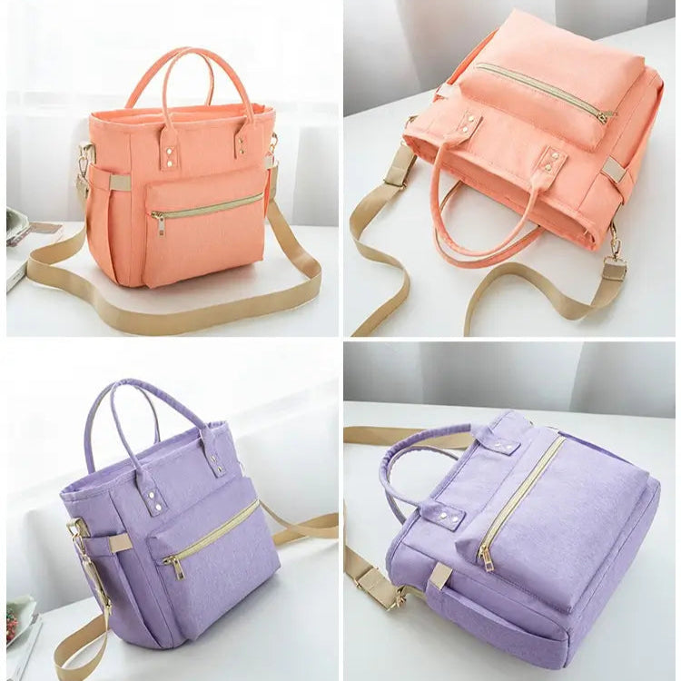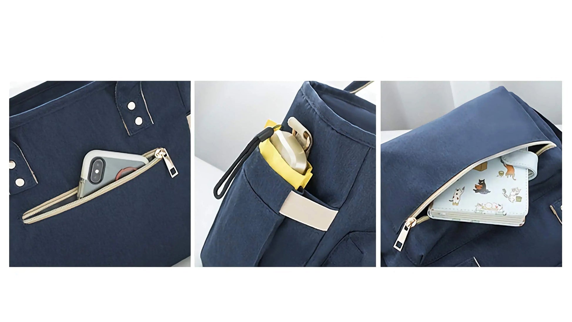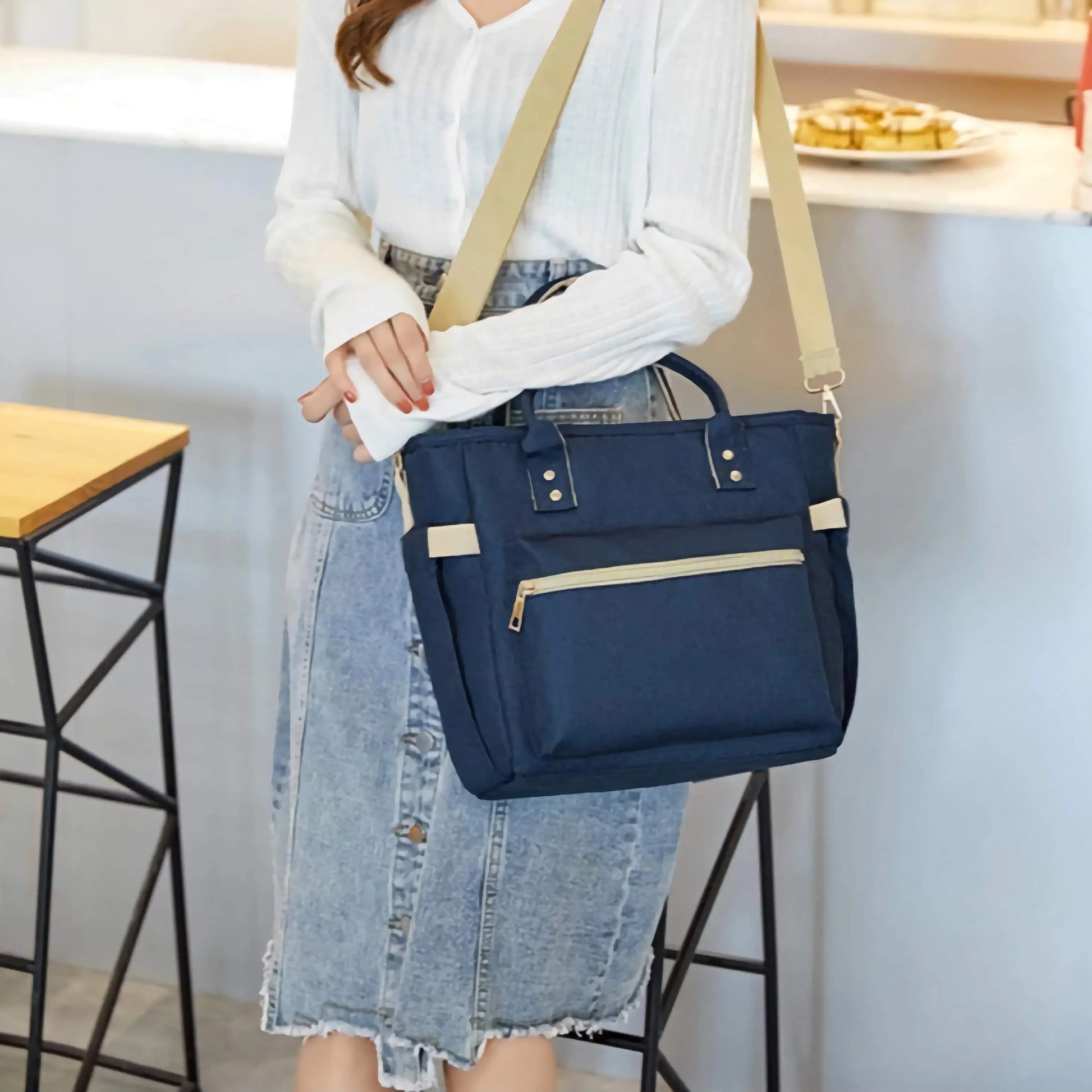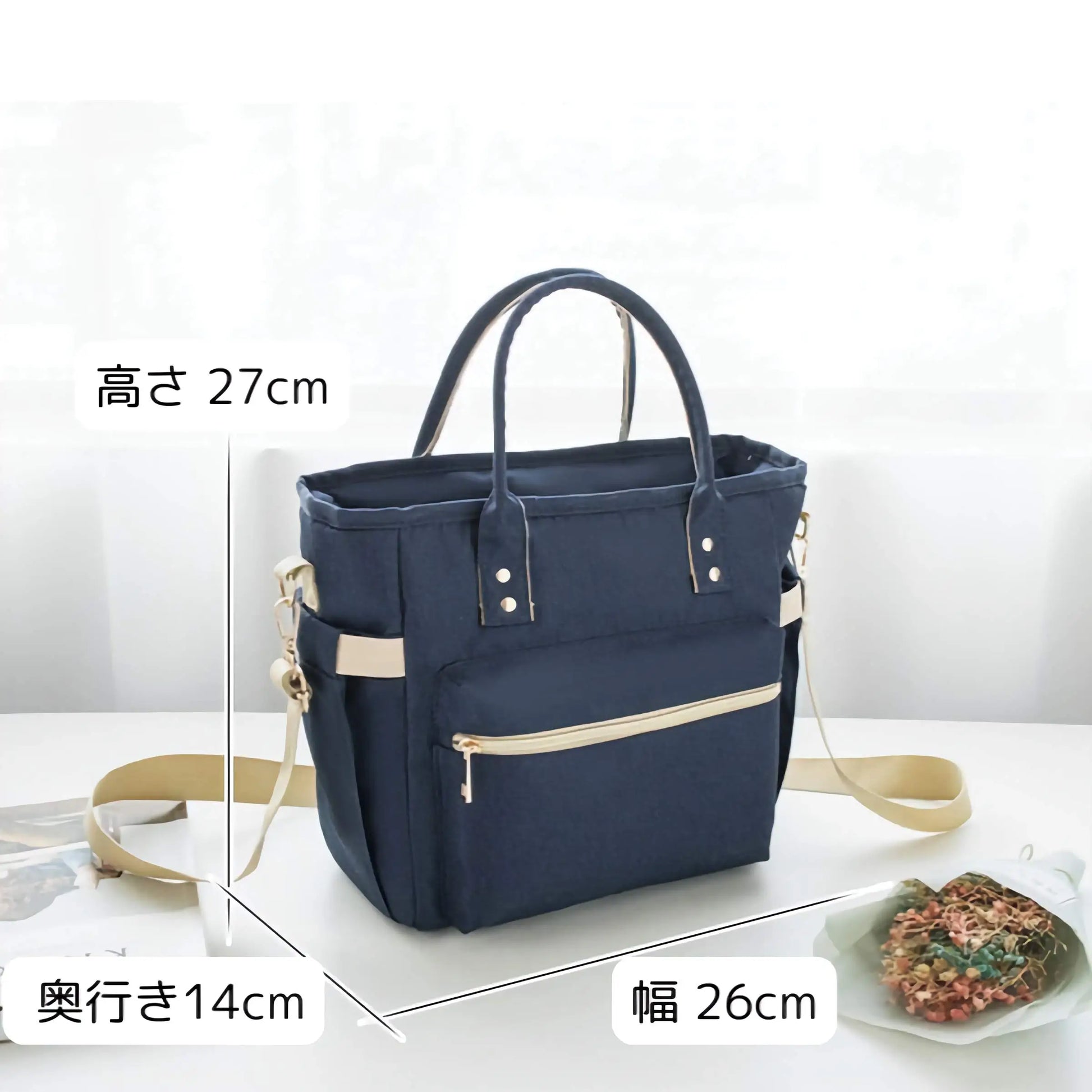 しっかり閉まるファスナー付きで、バッグの中身がこぼれる心配なし。コンパクトながら大容量設計で、お弁当箱・ボトル・お菓子・カトラリーまでしっかり収納できます。